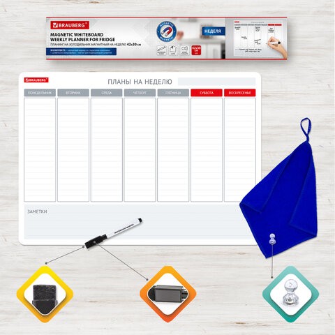 Особенности:-подходит для письма и рисования специальными маркерами для белой доски;-легко примагничивается к любой гладкой и ровной металлической поверхности.Поверхность планинга не боится воды, но избегайте попадания воды на края, во избежание расслаивания. Для очистки планинга используйте влажную салфетку. Корректируйте записи при помощи стирателя, встроенного в колпачок маркера.