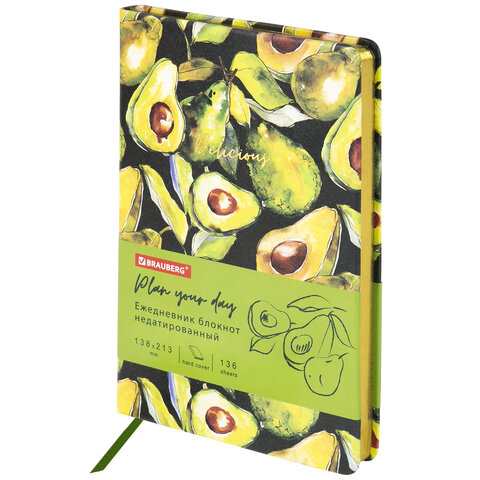 Ежедневник BRAUBERG VISTA "Avocado" предназначен для людей, которые ценят время и стараются каждый день проживать с максимальной пользой.Внутренний блок включает 136 листов тонированной бумаги цвета "слоновая кость" плотностью 70 г/м2. Благодаря стандартному формату А5 ежедневник удобно использовать как в офисе, так и на выездных деловых встречах. Твердая (книжная) обложка с полноцветной печатью и тиснением золотой фольгой делает ежедневник неповторимым и запоминающимся.Срез ежедневника фольгирован золотой фольгой, что придает ему особый шарм. Дополнением является закладка-ляссе, с помощью которой можно быстро открыть ежедневник на нужной странице. Помимо прочего ежедневник снабжен справочным материалом. В конце ежедневника есть 3 страницы для записей и заметок.