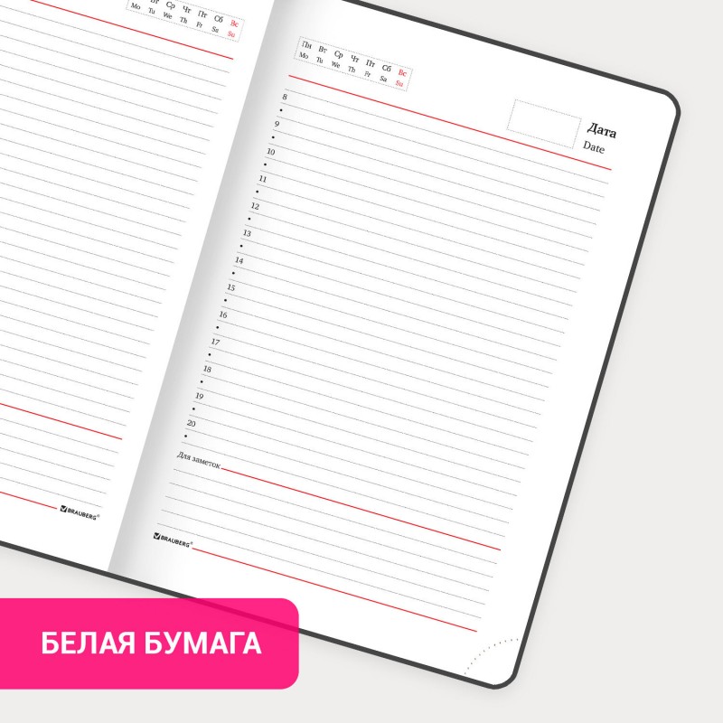 Внутренний блок включает 160 листов белой бумаги плотностью 70 г/м2. Каждая страничка имеет перфорированный угол. Благодаря стандартному формату А5 ежедневник удобно использовать как в офисе, так и на выездных деловых встречах. Твердая обложка, стилизованная под гладкую кожу, подходит для горячего тиснения. Снабжен магнитной застежкой, благодаря чему ежедневник не откроется в сумке или портфеле.