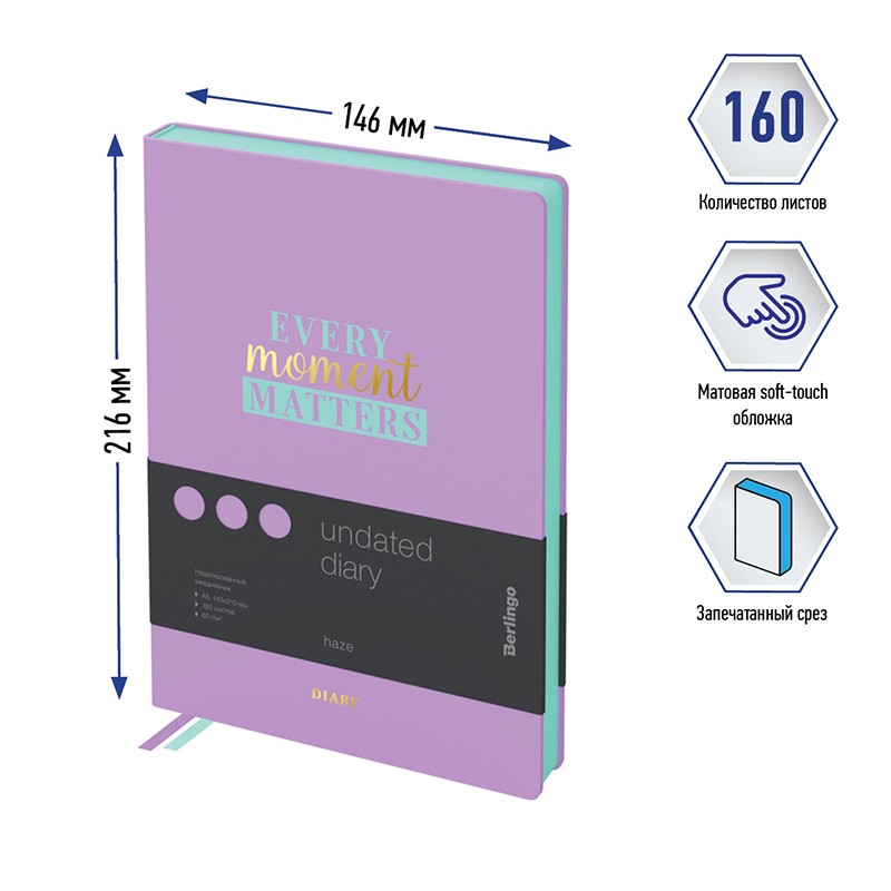 Недатированные ежедневники Berlingo "Haze" в твердой обложке с поролоновой подкладкой из искусственной кожи сиреневого цвета с дизайном. Софт-тач материал обложки. Мятный срез блока. Внутренний блок из 160 листов высококачественной кремовой бумаги повышенной плотности 80 г/м², пантонная печать в 2 краски, справочный материал и перфорированные уголки. Две закладки-ляссе. Отрывные заметки, бланки извещения о ДТП и справочные материалы. 3 комплекта стикеров станут приятным подарком. Индивидуальная упаковка. Подходят под персонализацию