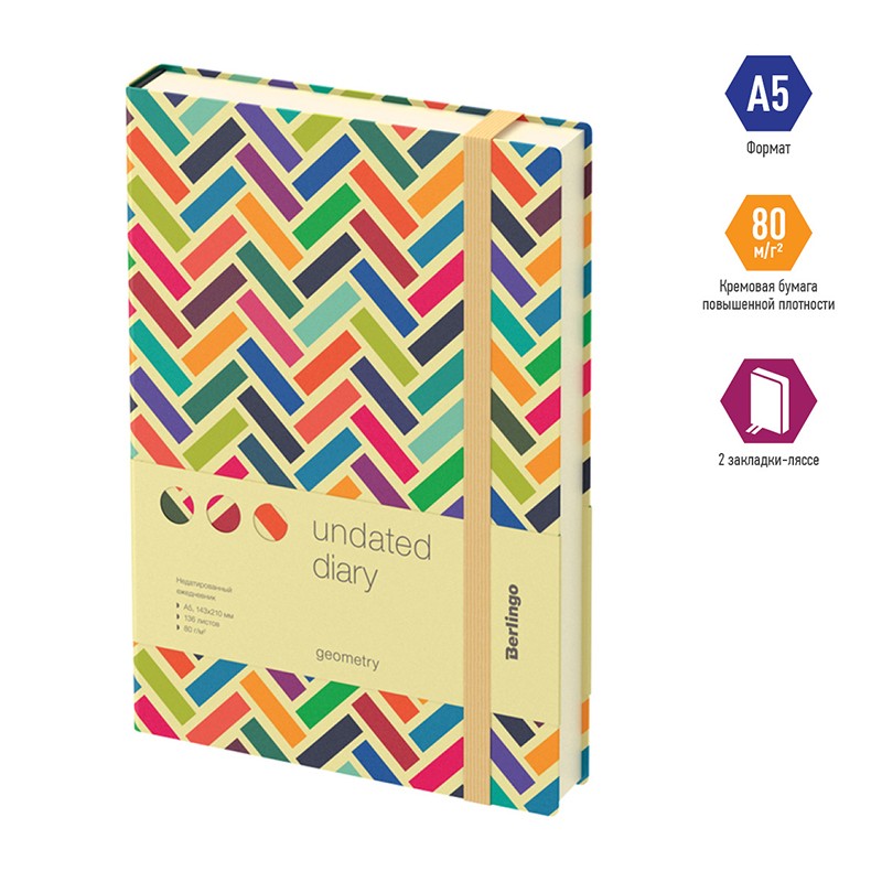 Стильный недатированный ежедневник Berlingo Geometry формата А5 с разноцветной полужёсткой обложкой из высококачественной экокожи. Яркие графические элементы создают необычный геометрический узор на обложке. Внутренний блок состоит из 136 листов высококачественной кремовой бумаги повышенной плотности 80 г/м² с пантонной печатью в 2 краски. Недатированный ежедневник Berlingo Geometry представлен в размере 143 на 210 мм.