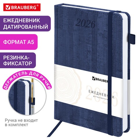 Датированный ежедневник BRAUBERG "Wood" имеет обложку из искусственной кожи, имитирующей структуру натурального дерева.Внутренний блок включает 168 листов белой бумаги плотностью 70 г/м2. Каждая страничка имеет перфорированный угол. Благодаря стандартному формату А5 (138х213 мм) датированный ежедневник удобно использовать как в офисе, так и на выездных деловых встречах.Твердая обложка стилизована под благородное дерево и выполнена в стильном синем цвете. Подходит для горячего тиснения. Снабжен резинкой-фиксатором, благодаря чему ежедневник не откроется в сумке или портфеле. Дополнениями являются закладка-ляссе, с помощью которой при необходимости можно быстро открыть ежедневник на нужной странице, и держатель для ручки. Ежедневник снабжен справочным материалом. В конце есть 4 страницы для записей и заметок.