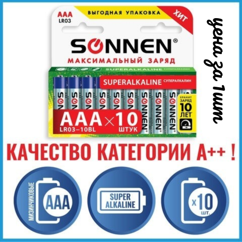 Батарейки КОМПЛЕКТ 10 шт., SONNEN Super Alkaline, AAA (LR03, 24А), алкалиновые, мизинчиковые, короб, 454232, Китай