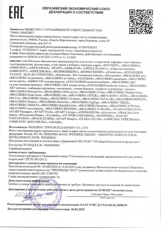 Обладают яркими насыщенными цветами в количестве 12 штук. Удобная круглая форма корпуса, длина которого 139 мм, а диаметр - 8,5 мм. Благодаря толщине линии письма 1 мм и диаметру пишущего узла 2,1 мм процесс раскрашивания становится легким. Длина письма составляет 600 м: такого расхода хватит надолго. Фломастеры изготовлены на водной основе, поэтому они безопасны и легко смываются с большинства материалов и кожи. Наконечник, устойчивый к продавливанию, не проваливается внутрь корпуса и не деформируется даже при сильном нажатии. Полипропиленовый корпус значительно продлевает срок службы фломастеров. Колпачок имеет специальные прорези для вентиляции, которые способствуют прохождению воздуха при попадании в дыхательные пути малыша. Рекомендованы для детей от 3-х лет.