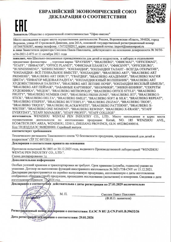 Фломастеры ПИФАГОР "ЕДИНОРОГ" дарят отличные впечатления в процессе раскрашивания каждому ребенку. Рисование способствует развитию мелкой моторики рук у детей, координации движений кистей и пальцев, что благоприятно влияет на творческое мышление.Обладают яркими цветами в количестве 12 штук. Длина корпуса удобной круглой формы составляет 145 мм, а диаметр - 8 мм. Благодаря толщине линии письма 1 мм и диаметру пишущего узла 1,8 мм процесс раскрашивания становится легким.Длина линии письма составляет 600 м – такого расхода хватит надолго. Фломастеры легко смываются с большинства материалов и кожи. Корпус изготовлен из качественного полипропилена, который значительно продлевает срок службы фломастеров. Колпачок оснащен специальными прорезями для вентиляции, которые делают использование фломастеров более безопасным.Рекомендованы для детей от 3-х лет.