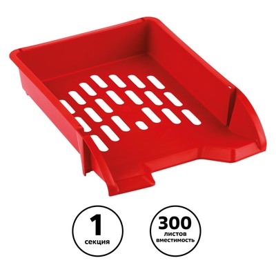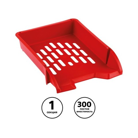 Лоток для бумаг горизонтальный "СТАММ" серии "Лидер" подходит для хранения и систематизации бумажной продукции формата А4. Прочный, вместительный корпус. Лоток имеет современный дизайн и сетчатую поверхность. Предусмотрена возможность установки одного лотка на другой. Изготовлен из качественного пластика. Изделие высотой 70 мм, глубиной 340мм и шириной 255мм вмещает до 300 листов. Индивидуальная упаковка - пакет. Цвет лотка - красный
