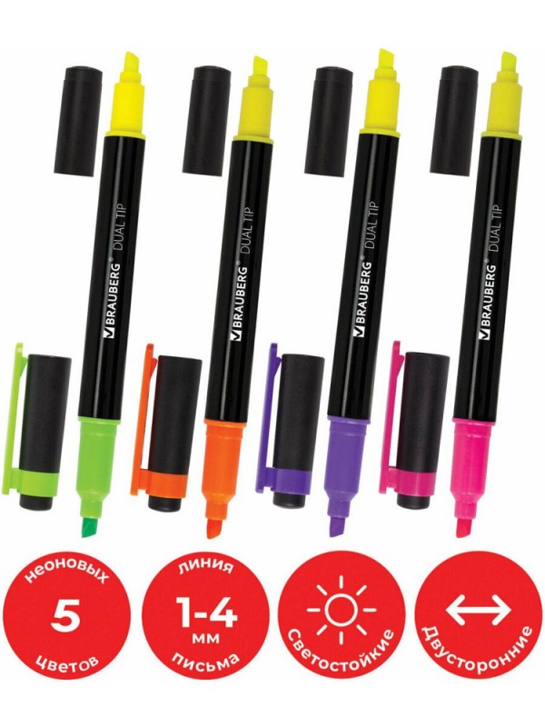 Текстовыделители BRAUBERG DUAL TIP предназначены для выделения текста на бумаге любого типа, включая факс-бумагу.В наборе 4 двусторонних текстовыделителя неоновых цветов: желтый/зеленый, желтый/фиолетовый, желтый/розовый, желтый/оранжевый. Круглая форма корпуса диаметром 11 мм. Корпус тектовыделителя оснащен удобной зоной захвата. Скошенный наконечник имеет толщину линии письма от 1 до 4 мм, что обеспечивает удобство при работе с текстом, напечатанным мелким шрифтом, или таблицами. Текстовыделитель обладает экономным расходом чернил. Светоустойчивые чернила на водной основе не выцветают даже на открытом солнце и не размазываются в процессе использования. Изделие не перезаправляется. Цвет клипа соответствует цвету чернил