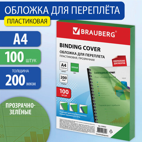 Обложки пластиковые для переплета, А4, КОМПЛЕКТ 100 шт., 150 мкм, прозрачные, BRAUBERG, 530825 Китай