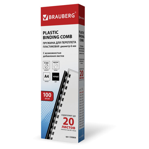 Пластиковая пружина для переплета документов BRAUBERG совместима с большинством переплетных машин. Преимуществом является возможность быстро извлечь документы из переплета или добавить листы в уже переплетенный документ.Рекомендуется использовать для переплета документов объемом от 10 до 20 листов. Изготовлена из высококачественного пластика чёрного цвета. Состоит из 21 кольца диаметром 6 мм. В упаковке 100 штук.