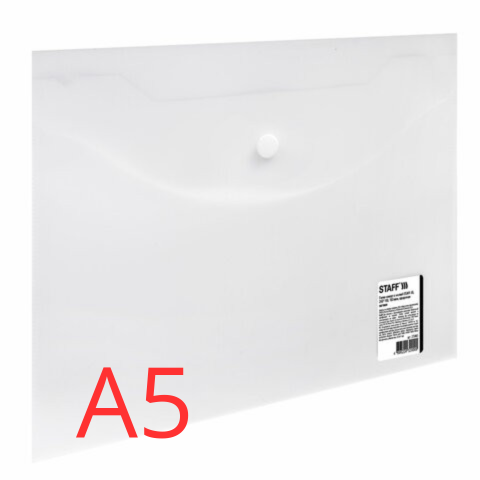 Папка-конверт с кнопкой STAFF - универсальная модель для хранения, транспортировки и защиты документов от повреждений природного и механического характера. Станет незаменимым помощником для школьников, студентов, офисных работников и творческих людей.Папка-конверт с гладкой фактурой формата А5 изготовлена из плотного матового полупрозрачного пластика толщиной 150 мкм. Закрывается на защелку-кнопку, что способствует удобству при частом использовании и обеспечивает быстрый доступ к содержимому. Папка способна вместить до 100 листов стандартной плотности.