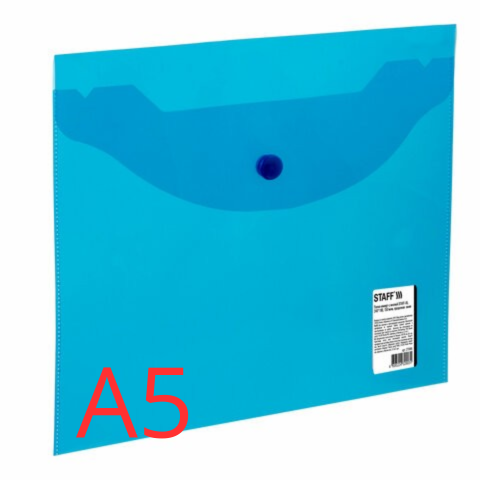 Папка с кнопкой STAFF - универсальная модель для хранения, транспортировки и защиты документов и мелких предметов от воздействия негативных внешних факторов. Станет незаменимым помощником для школьников, студентов, офисных работников и творческих людей.Папка-конверт с гладкой фактурой формата А5 изготовлена из плотного матового полупрозрачного синего пластика толщиной 150 мкм. Закрывается на защелку-кнопку, что обеспечивает быстрый доступ к бумагам. Папка вмещает до 100 листов стандартной плотности.