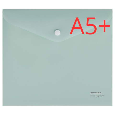 Папка-конверт на кнопке СТАММ «Акцент» формата А5+ надежно защищает документы от влаги и пыли. Горизонтальное изделие вмещает до 100 листов. Цвет папки – эвкалиптовый. Она изготовлена из качественного полипропилена плотностью 180 мкм с матовой текстурой. Размер папки составляет 240*215 мм. Изделие плотно закрывается на кнопку.