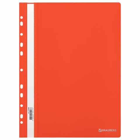 Классический мягкий пластиковый скоросшиватель BRAUBERG предназначен для систематизации, хранения и транспортировки документов. Защищает бумаги от загрязнений, пыли, влаги и прочих механических повреждений.Скоросшиватель изготовлен из качественного полипропилена. Фиксирует до 100 листов формата А4. Толщина пластика верхнего листа составляет 140 мкм, нижнего – 180 мкм. Предельно простой механизм подшивки: металлические усики и пластиковая планка для надежной фиксации документов.Прозрачный верхний лист позволяет идентифицировать подшитый документ, не открывая скоросшиватель. Сменный пластиковый корешок помогает структурировать информацию. Благодаря фактуре "песок" и яркому красному цвету обложки папка никогда не затеряется на полке.