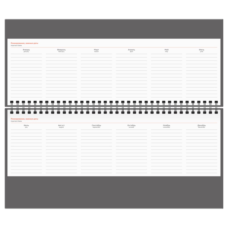 Твёрдая обложка изготовлена из балакрона (переплётного материала с покрытием ПВХ) зелёного цвета. Блинтовое тиснение придаёт элегантный вид. Кроме блоков для важных задач и заметок, планинг включает телефонную книгу и календарь на четыре года.