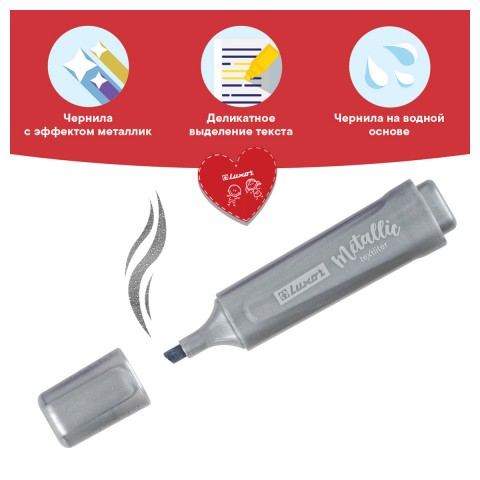 Текстовыделитель Luxor "Textliter Metallic" выделяет ярко и без запаха . Чернила на водной основе быстро сохнут, не оставляют разводов и подходят для всех типов бумаги. Скошенный наконечник позволяет варьировать ширину линии письма от 1 до 5 мм. Чернила с эффектом металлик создадут необычные переливы при письме. Цвет чернил - серебро.