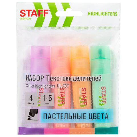 Текстовыделители STAFF "EVERYDAY HL-707" предназначены для выделения текста на бумаге любого типа. Идеально подходят для учебных, домашних и офисных задач.4 пастельных цвета в наборе: мятный, лавандовый, пастельный розовый и персиковый, – позволяют создать мягкие переходы и равномерно подчеркивают необходимую информацию. Колпачок и корпус соответствуют цвету чернил.Прямоугольный корпус диаметром 24 мм оснащен удобной зоной захвата. Скошенный наконечник имеет толщину линии письма от 1 до 5 мм, что обеспечивает удобство при работе с текстом, напечатанным мелким шрифтом, или таблицами. Светоустойчивые чернила на водной основе не выцветают даже на открытом солнце, быстро впитываются и не размазываются в процессе использования.Текстовыделители обладают экономным расходом чернил. Изделия не перезаправляются.Это товар эконом-сегмента, поэтому он отличается привлекательной ценой. Товар обладает базовым набором характеристик и простой упаковкой, при этом полностью соответствует основным требованиям потребителей.