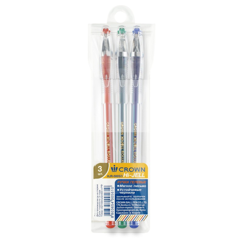 Набор гелевых ручек Crown Hi-Jell Color поможет выделить в тексте заголовки и определения или сделать самый яркий рисунок. Диаметр пишущего узла - 0,5 мм, благодаря чему ручка оставляет тонкую и изящную линию. Корпус сделан из высококачественного пластика, который при поломке не оставляет мелких осколков. Корейские гелевые чернила на водной основе обладают высокой светостойкостью и водостойкостью, мгновенно высыхают, не смазываются. Благодаря гелеобразным чернилам и специальной технологии пишущего узла гелевые ручки Crown обеспечивают мягкое и комфортное письмо. Цвет чернил – ассорти (красный, синий, зеленый). Набор упакован в чехол из ПВХ с европодвесом.
