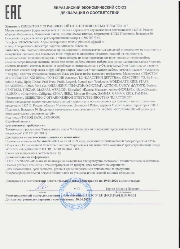 Детали | Декларация о соответствии ЕАЭС N RU Д-RU.РА01.В.50506/21 от 30.04.2021 по 39.04.2026 г. |