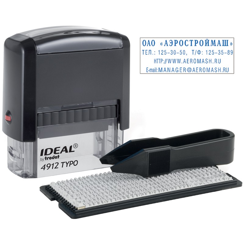 Прочный пластиковый корпус с прямоугольной рифленой пластиной. Автоматическое окрашивание. В комплект также входит: пинцет, касса символов 6005, синяя сменная подушка. Символы надежно закрепляются в текстовой пластине (две ножки). При замене текста обязательно заменить подушку. Используется для набора штампов с почтовыми, банковскими реквизитами и др. меняющейся информацией, без рамки. Размер: 47 мм х 18 мм. Максимальное количество знаков в строке основного шрифта: 28. Шрифта для выделения текста: 19. Максимальное количество строк: 4.