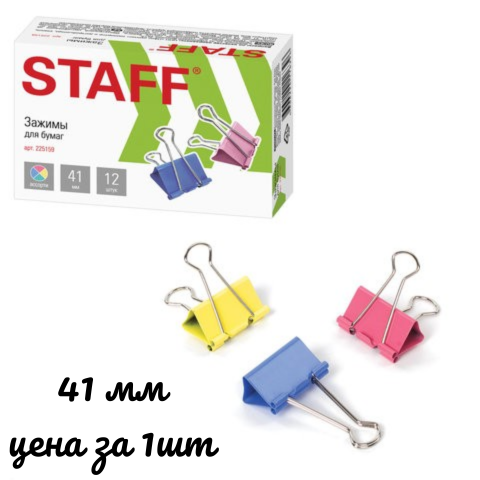 Зажимы для бумаг STAFF предназначены для скрепления документов без использования степлера.Изготовлены из стали с черным покрытием. Позволяют скреплять до 200 листов. Не деформируют бумагу. Ширина зажима - 41 мм. Поставляются по 12 штук в картонной коробке.
