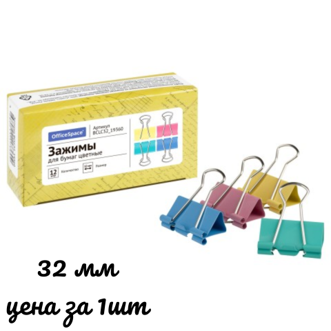 Изготовлены из стали с цветным покрытием. Позволяют скреплять до 140 листов. Не деформируют бумагу. Ширина зажима - 32 мм. Поставляются по 12 штук в картонной коробке.
