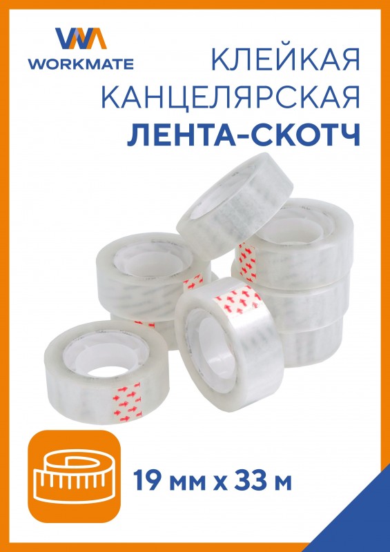Клейкая лента канцелярская Workmate универсальная имеет полипропиленовую основу с клеевым слоем, обладает высокой клеящей способностью. Предназначена для склеивания бумаги, картона, крепления легких предметов на любые гладкие поверхности. Скотч канцелярский прозрачный Workmate так же является универсальным упаковочным материалом. Отлично подойдет для склеивания упаковочной бумаги, небольших пакетов и конвертов, мелкого ремонта книг, документов. Широко применяется в школе, офисе, дома для канцелярских, бытовых нужд и творчества. Лента проста в использовании, легко разматывается, не оставляет липких следов на руках и гладких поверхностях. Имеет долгий срок хранения и не желтеет со временем. Ширина ленты 19 мм, длина намотки 33 м