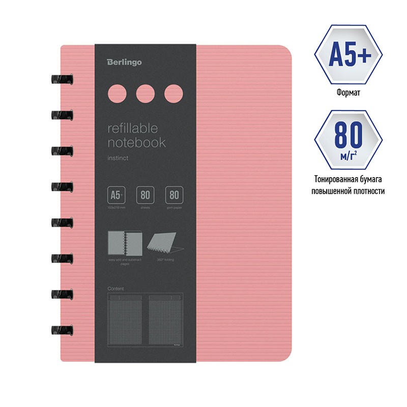 Бизнес-тетрадь Berlingo "Instinct" - это практичное, стильное и современное изделие для планирования и записей. Такая бизнес-тетрадь является незаменимым инструментом для деловых людей. Увеличенная толщина обложки (1500мкм). Формат А5+. Насыщенный пастельный розовый цвет внешней стороны в сочетании с фактурой "горизонтальные линии". Черный цвет внутренней поверхности. Материал обложки - трехслойный пластик (полифом), надежно защищает внутренний блок от влаги, замятия и загрязнения, обложка устойчива к загрязнениям. Вид скрепления – стильные имиджевые черные кольца, с возможностью раскрывать тетрадь на 360⁰. Возможна замена бумажного блока и быстрая и удобная выемка/вставка листов без повреждений. Бизнес-тетрадь содержит съемную брендированную линейку, которую можно использовать как закладку или разделитель и с легкостью можно перемещать в удобное место. Внутренний блок – высококачественная тонированная бумага, плотностью 80г/м2, 80 листов в клетку, рамка для заголовка, темы или даты, поля с обеих сторон блока на каждом листе, линовка на вылет. Размер бизнес-тетради 220*160мм, диаметр колец 22мм. Упаковка в термоусадочную пленку позволяет предохранить листы от замятия и загрязнения в процессе транспортировки.