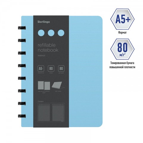 Бизнес-тетрадь Berlingo "Instinct" - это практичное, стильное и современное изделие для планирования и записей. Такая бизнес-тетрадь является незаменимым инструментом для деловых людей. Увеличенная толщина обложки (1500мкм). Формат А5+. Насыщенный пастельный голубой цвет внешней стороны в сочетании с фактурой "горизонтальные линии". Черный цвет внутренней поверхности. Материал обложки - трехслойный пластик (полифом), надежно защищает внутренний блок от влаги, замятия и загрязнения, обложка устойчива к загрязнениям. Вид скрепления – стильные имиджевые черные кольца, с возможностью раскрывать тетрадь на 360⁰. Возможна замена бумажного блока и быстрая и удобная выемка/вставка листов без повреждений. Бизнес-тетрадь содержит съемную брендированную линейку, которую можно использовать как закладку или разделитель и с легкостью можно перемещать в удобное место. Внутренний блок – высококачественная тонированная бумага, плотностью 80г/м2, 80 листов в клетку, рамка для заголовка, темы или даты, поля с обеих сторон блока на каждом листе, линовка на вылет. Размер бизнес-тетради 220*160мм, диаметр колец 22мм. Упаковка в термоусадочную пленку позволяет предохранить листы от замятия и загрязнения в процессе транспортировки.