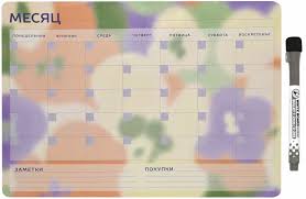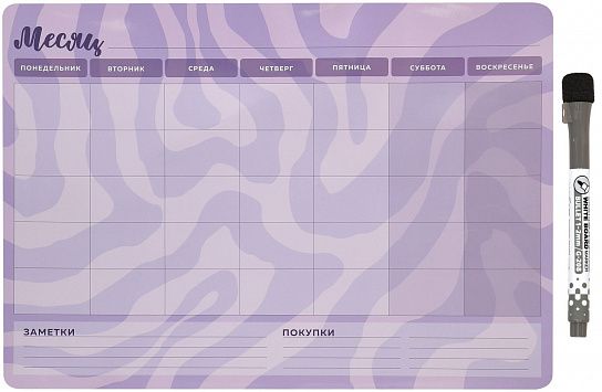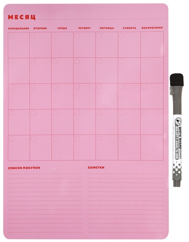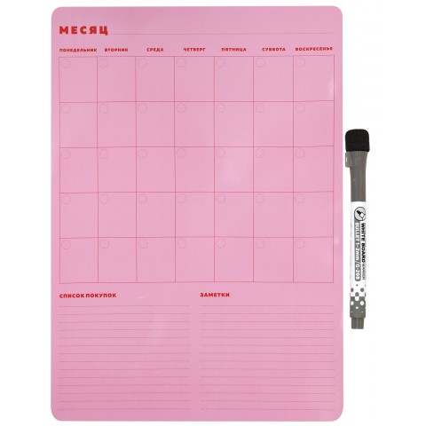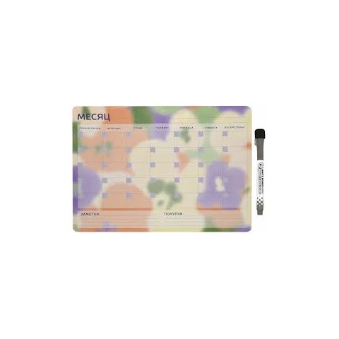Особенности:-подходит для письма и рисования специальными маркерами для белой доски;-легко примагничивается к любой гладкой и ровной металлической поверхности.Поверхность планинга не боится воды, но избегайте попадания воды на края, во избежание расслаивания. Для очистки планинга используйте влажную салфетку. Корректируйте записи при помощи стирателя, встроенного в колпачок маркера.