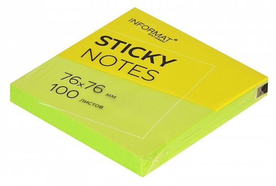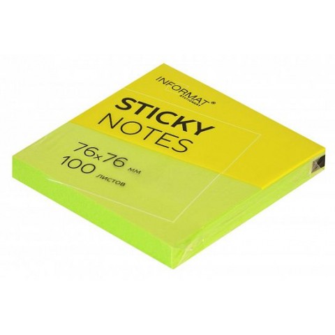 Блок для записи из офсетной бумаги с клейким слоем. Листочки отлично держатся на мониторе, принтере, компьютере. Не скручиваются и не оставляют следов. В блоке 100 листов. Размер: 76х76 мм. Плотность бумаги: 75 г/м2. Клейкость: 18 Н/м. Цвет: зеленый неоновый. Упаковка: термопленка.