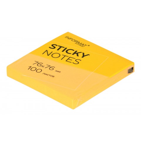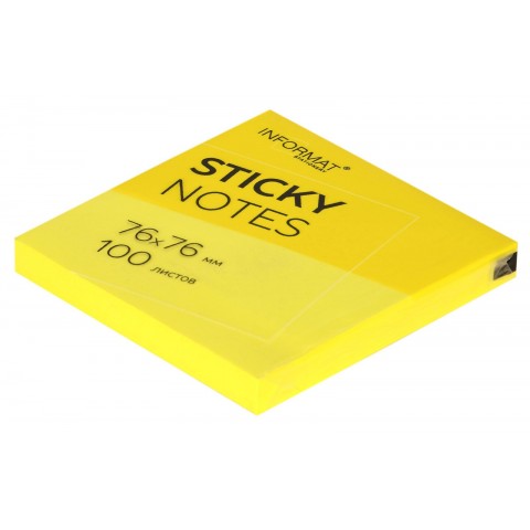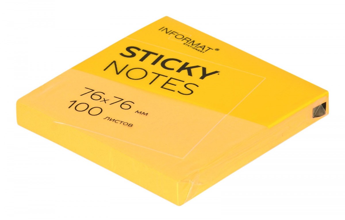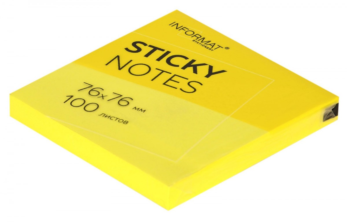Блок для записи из офсетной бумаги с клейким слоем. Листочки отлично держатся на мониторе, принтере, компьютере. Не скручиваются и не оставляют следов. В блоке 100 листов. Размер: 76х76 мм. Плотность бумаги: 75 г/м2. Клейкость: 18 Н/м. Цвет: желтый неоновый. Упаковка: термопленка.