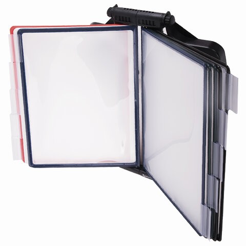 10 двухсторонних цветных панелей позволяют разместить одновременно до 20 листов формата А4. Прочные и гибкие литые рамки панелей изготовлены из полипропилена, пригодного для повторной переработки и дальнейшего использования. Демопанели оснащены съемными ярлычками-табуляторами для маркировки и удобного поиска нужной информации. Карман демопанели из прочного прозрачного материала с антибликовым покрытием надежно защитит документы от внешних воздействий. Система удобна в обращении благодаря регулируемуму наклону разсположения панелей. Имеет устойчивое утяжеленное основание. Винты для крепления демосистемы к стене поставляются в комплекте. Стильный черный цвет пластикового корпуса подойдёт для большинства современных интерьеров.