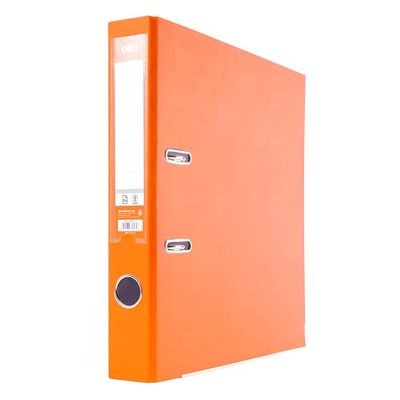 Папка-регистратор Deli из картона с ПВХ-покрытием и c металлическим уголком. Имеет на торце этикетку для подписи, круглое отверстие для захвата, на лицевой поверхности находятся прорези-замки для замыкания папки в закрытом состоянии. Цвет — оранжевый. Ширина корешка — 50 мм.