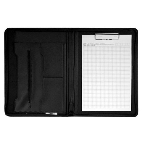 Обновленный вариант папки Лидер. Материал — искусственная кожа. Закрывается на молнию. Объемный карман для документов, дополнительные карманы для документов разного формата. Металлический прижим для бумаг. Комплектуется отрывным блоком для записей формата А4. Размеры: 34x22 см.