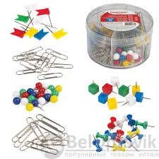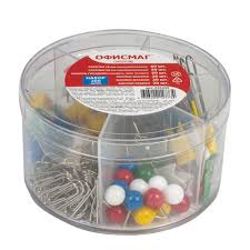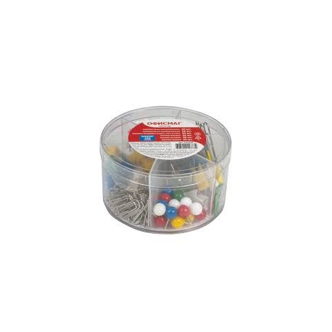 Набор канцелярских мелочей ОФИСМАГ объединяет в себе кнопки-гвоздики, кнопки-кубики, кнопки-флажки, кнопки-шарики, скрепки 28 мм, скрепки 50 мм. Упаковка одновременно является и органайзером для хранения канцелярских мелочей на столе.В наборе:- кнопки-гвоздики, цветные (ассорти) - 50 шт.;- кнопки-кубики, цветные (ассорти) - 20 шт.;- кнопки-флажки, цветные (ассорти) - 20 шт.;- кнопки-шарики, цветные (ассорти) - 20 шт.;- скрепки 28 мм, никелированные - 60 шт.;- скрепки 50 мм, цветные (ассорти) - 30 шт.Общее количество предметов - 200 шт.Поставляются в пластиковом цилиндре с отделениями для каждого вида товара.
